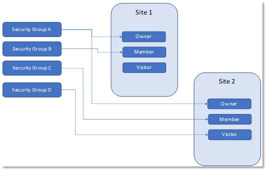 The following illustration shows an example mapping between 365 security groups and SharePoint groups.