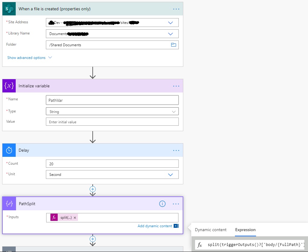 Start with a When a file is created (properties only) trigger (works with folders too) and then create a string variable. For some reason I added a short delay to maybe give SharePoint a bit of time to create the file, you may not need this.